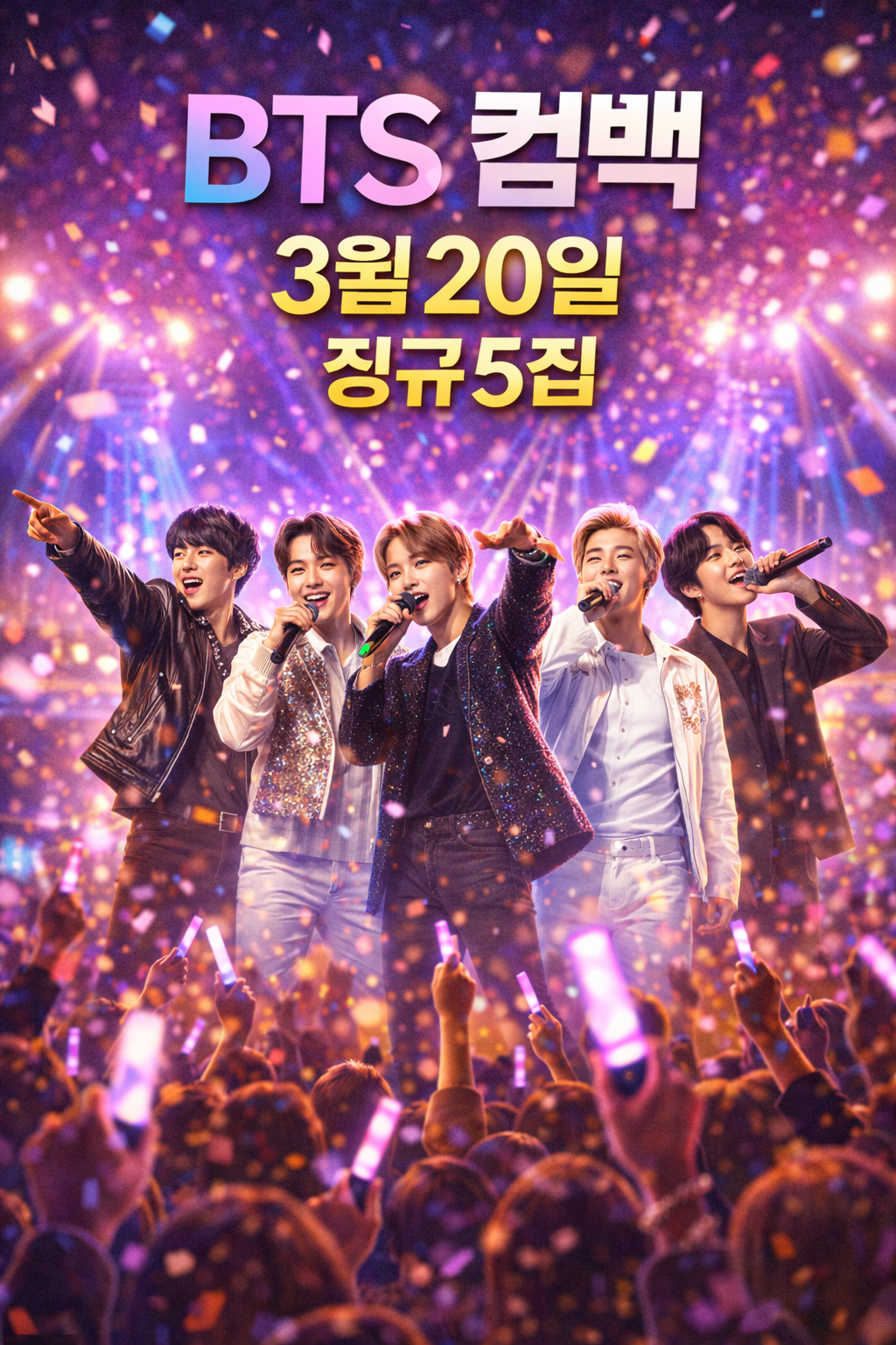 - 컴백일정: BTS는 2026년 3월 20일(금) 오후 1시 KST 정규 5집을 발매하며 완전체 컴백을 공식 확정했다.